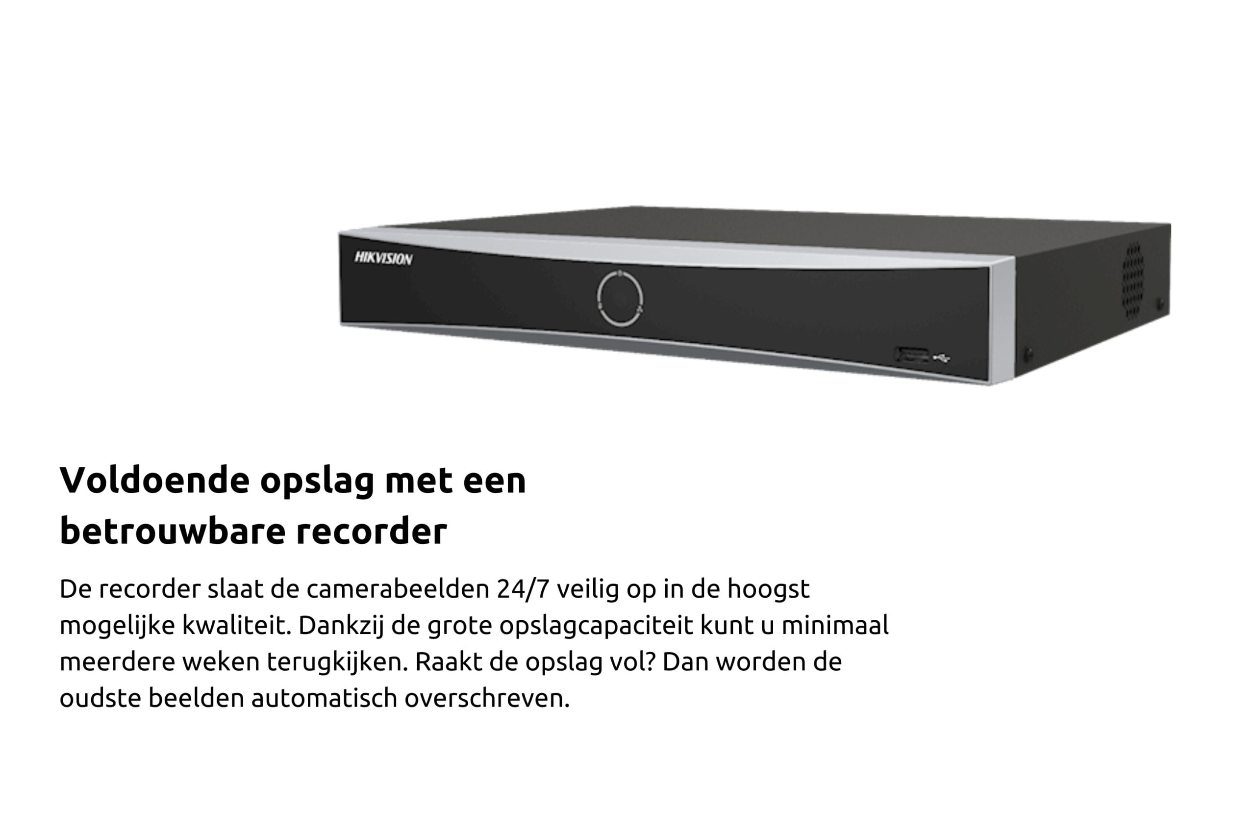 Een belangrijk onderdeel van een camerasysteem is de recorder. Op de recorder worden alle beelden veilig opgeslagen. Deze recorder is geschikt voor hoge kwaliteit opnames en voorzien van een looping-record functie. Dat houdt in dat als de harde schijf vol raakt, de oudste beelden automatisch overschreven worden.
